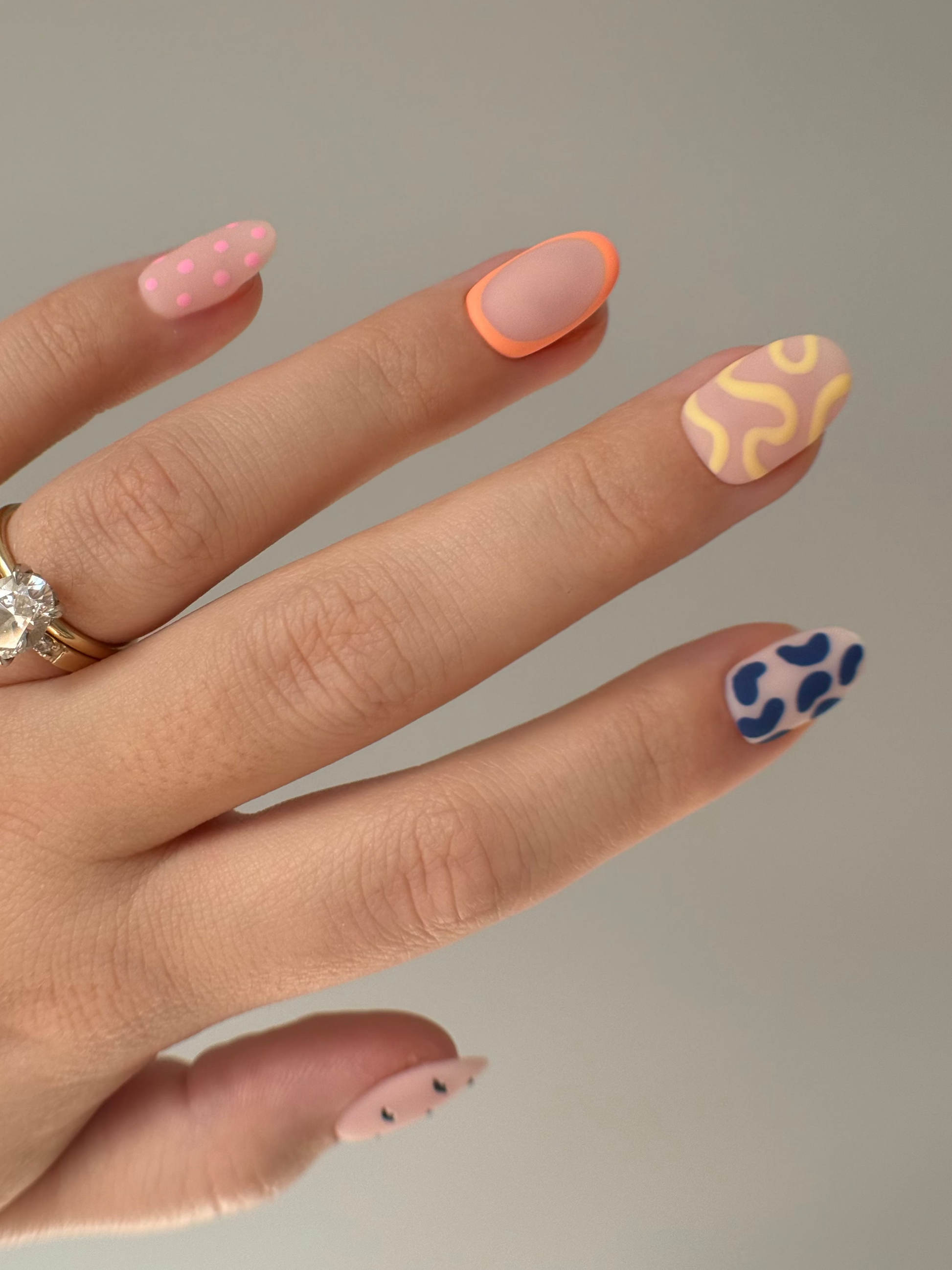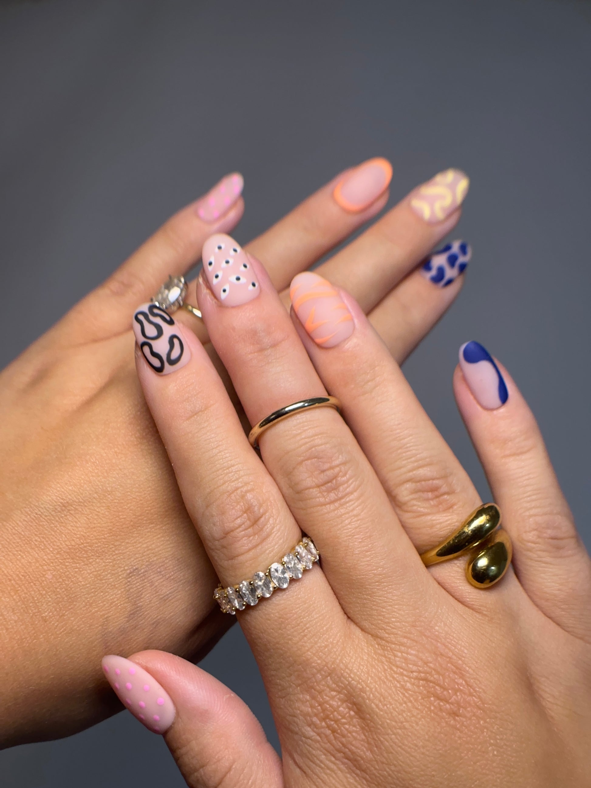 The Abstract Energy set is a fearless mix of fun. Featuring matte finishes, bold colour combos, and a clash of patterns — from animal print to polka dots and neon squiggles—this design is made for those who love to mix things up. Every nail brings something different, but together they create a look that’s totally unique and full of personality.