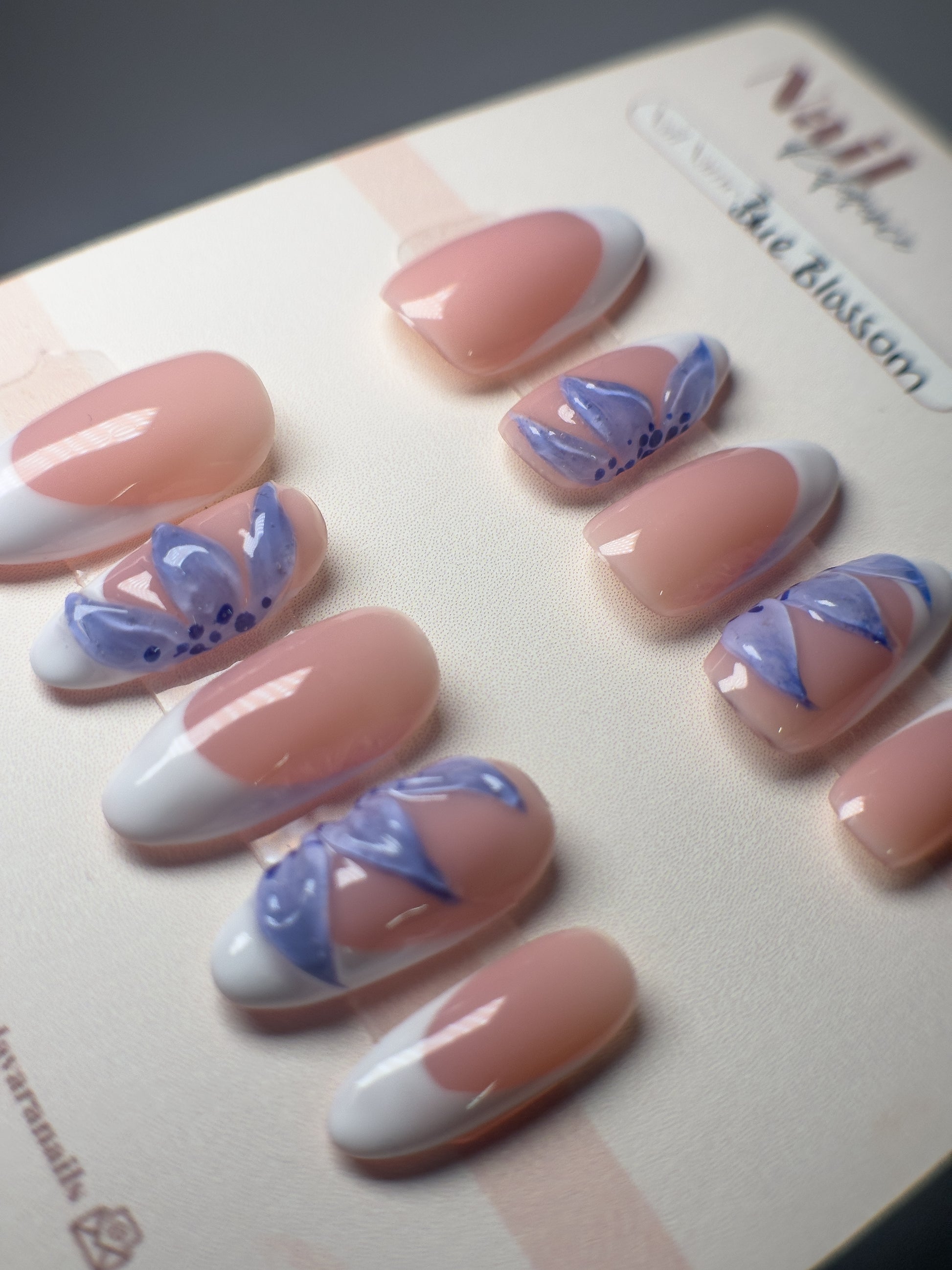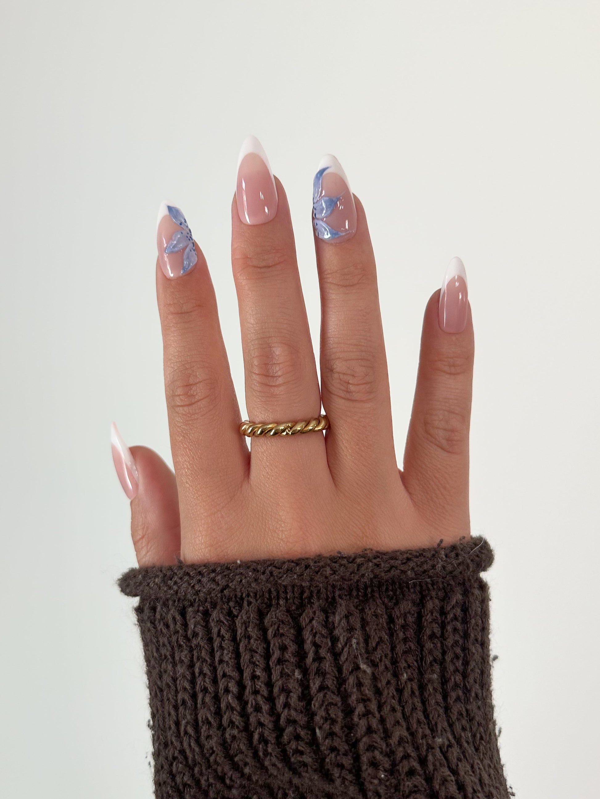 Soft meets statement in Blue Blossom - a dreamy French manicure with a botanical twist. Classic white tips provide a clean timeless base, while accent nails bloom with delicate 3D blue flower, adding a touch of whimsy and charm. This set is perfect for spring occasions, garden parties, or wherever you want your nails to feel as fresh and graceful as a petal in bloom.