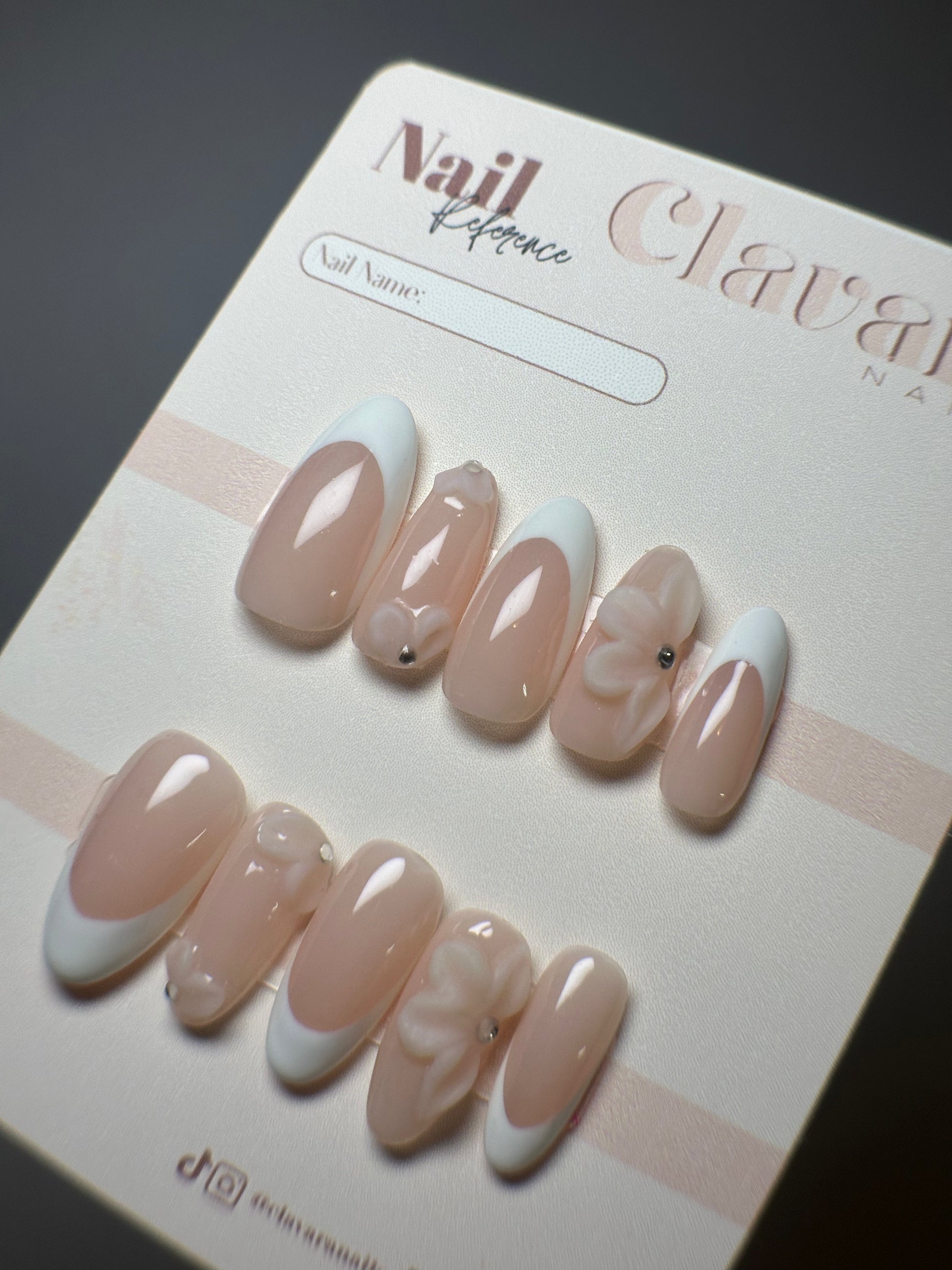 Soft elegance meets timeless charm in this romantic set. Featuring a natural nude base with crisp french tips, these nails are elevated with delicate 3D floral accents and subtle rhinestone details for just the right touch of sparkle. French Bloom is perfect for bridal moments, special occasions, or anyone who loves a clean, feminine aesthetic with a bit of flair.