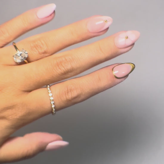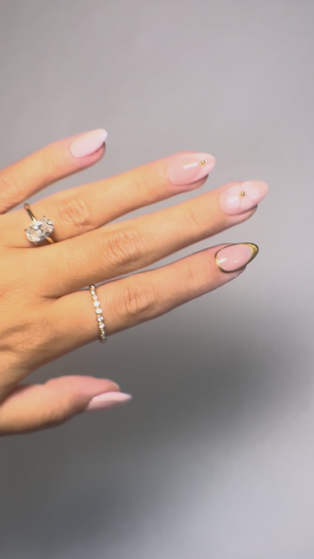 Discover understated luxury with Gold Petal — blush pink press-ons accented by subtle golden French tips and a delicate flower embellished with a tiny gold bead. Carefully handmade for a minimal yet elegant finish that complements any outfit, from special events to daily sophistication. Classic beauty with a golden touch.
