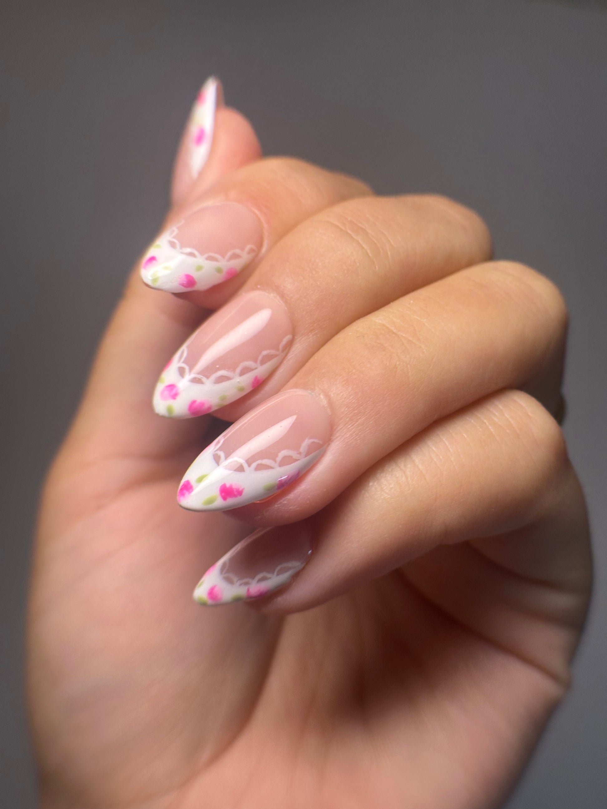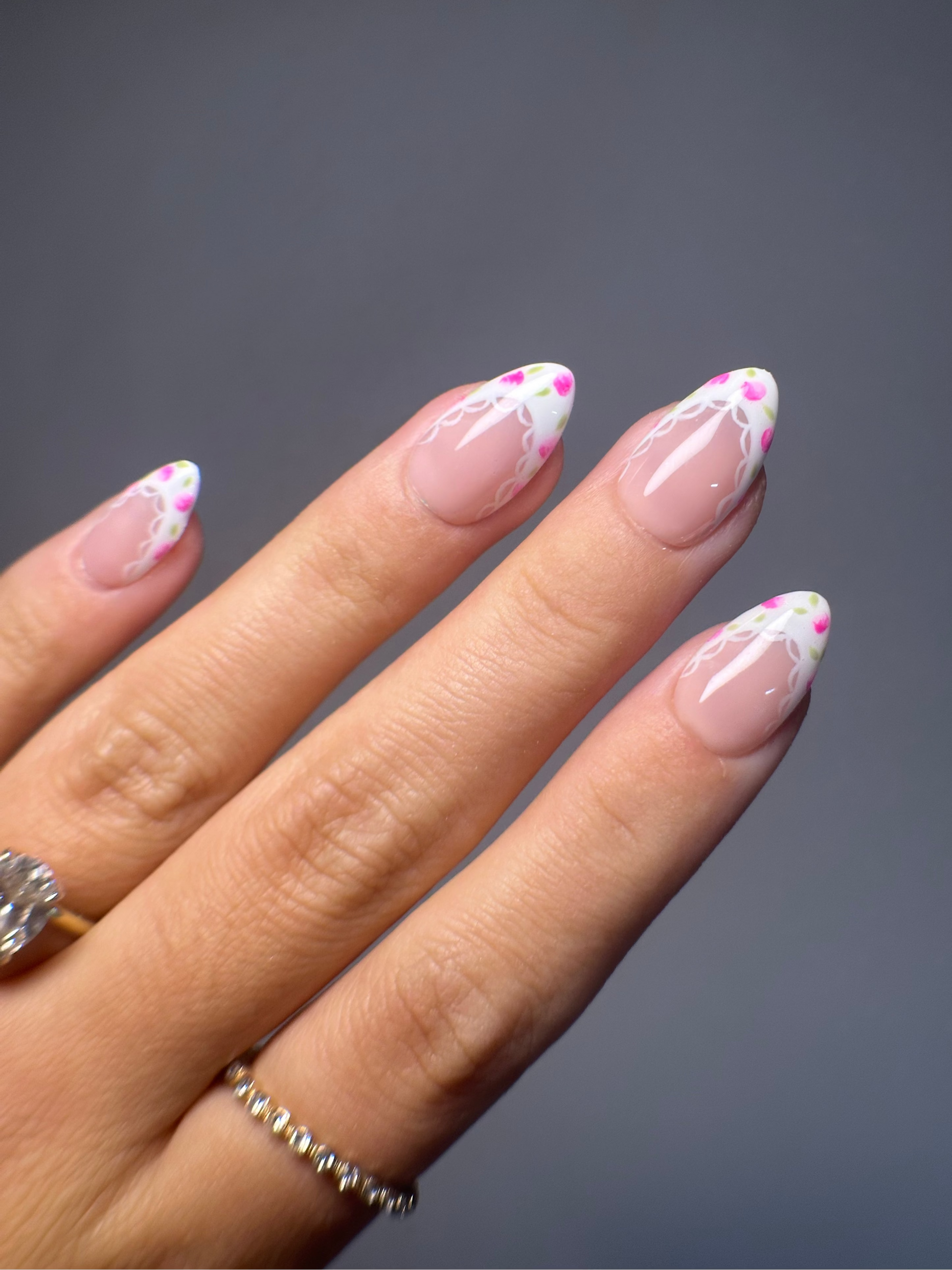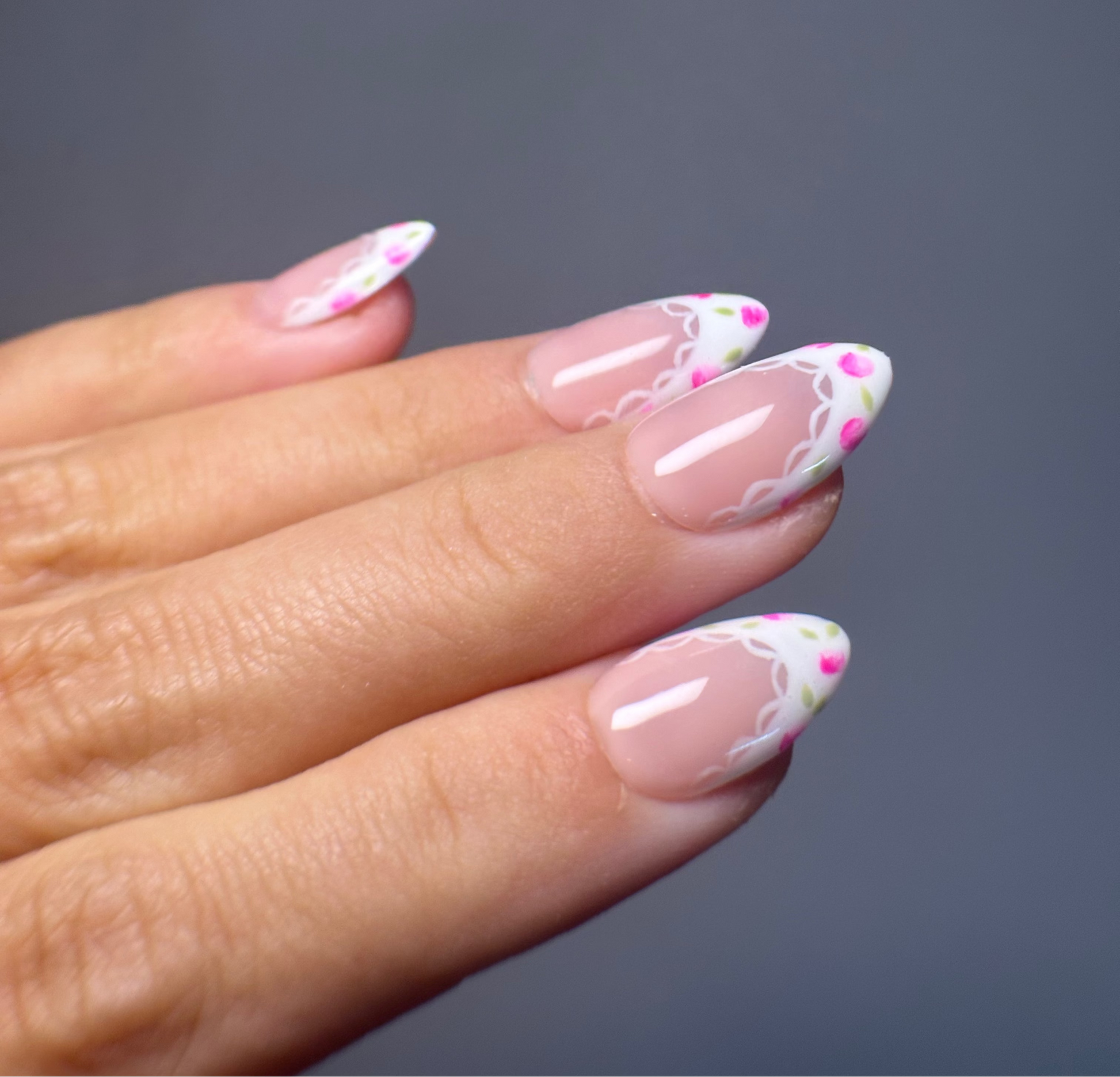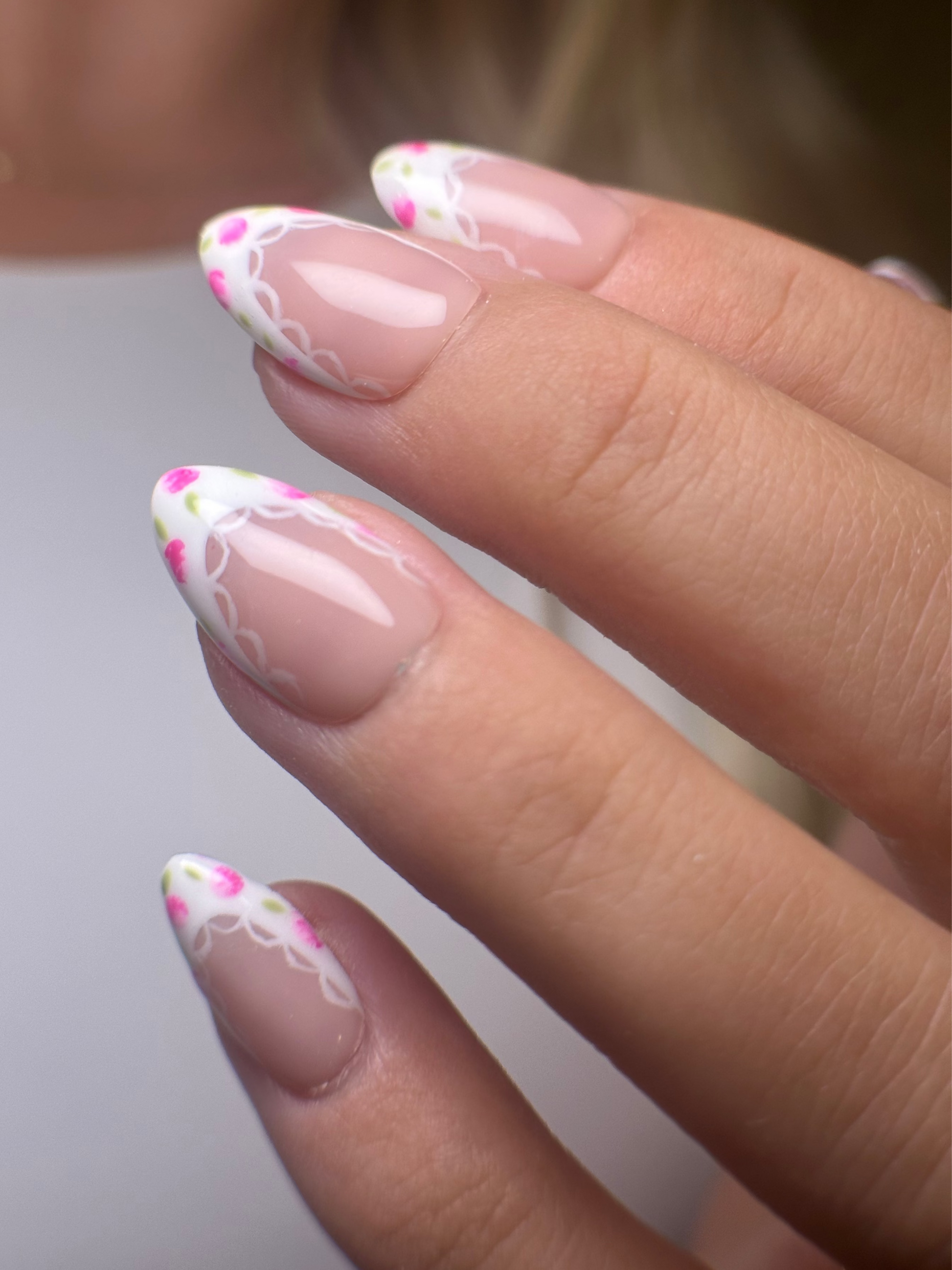 Step into spring with Lace Garden — romantic luxury press-ons featuring soft pink almond nails, hand-painted lace tips, and dainty pink floral details. Each piece is handmade with love, capturing the dreamy, cottagecore feel of a blooming garden. Perfect for adding a touch of whimsy and charm to any look.