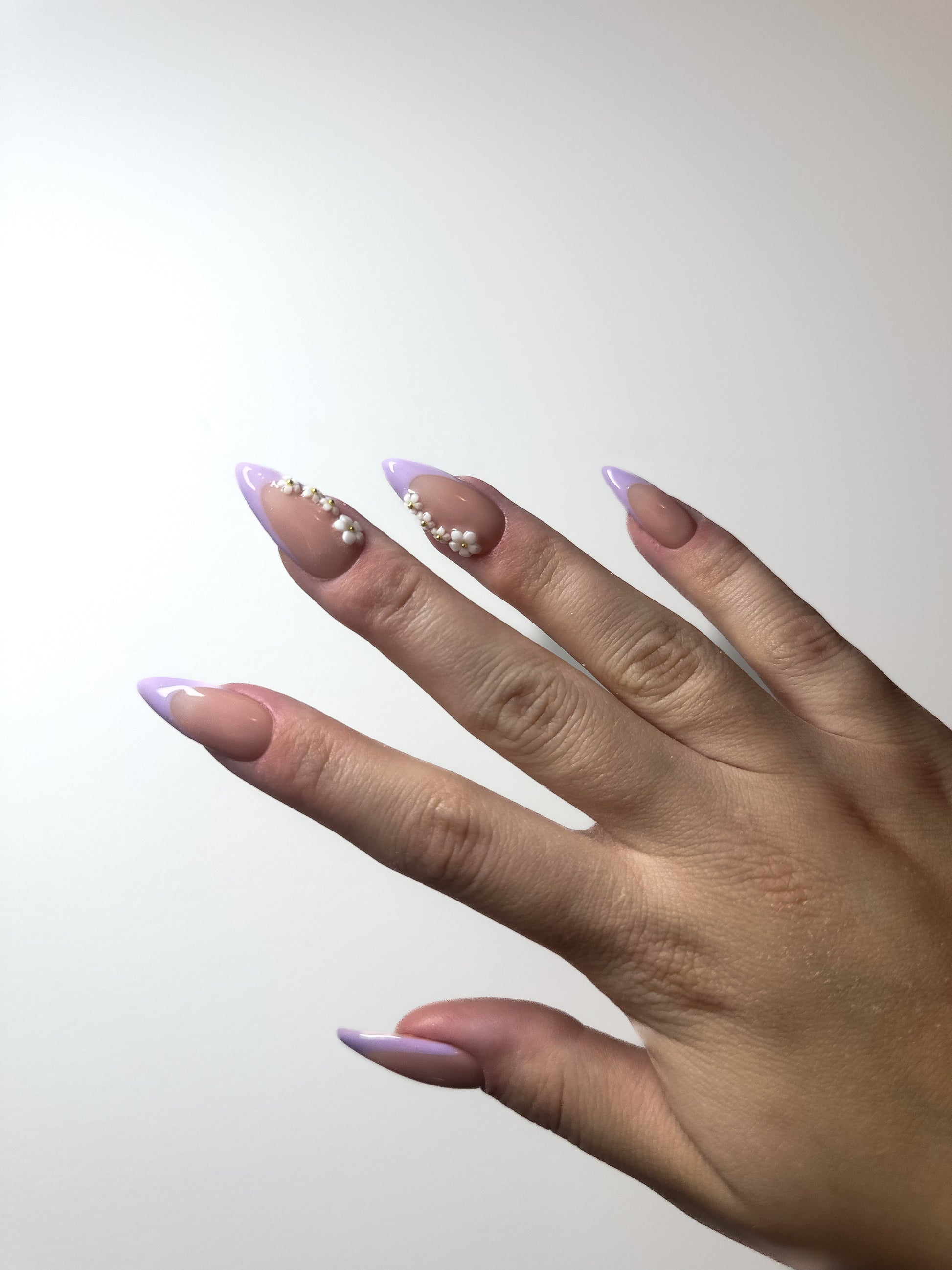 Soft, dreamy, and effortlessly elegant - Lilac Bloom is your go-to or a whimsical yet polished look. This set features a nude base with delicate lilac french tips that feel fresh and romantic. Adorned with dainty white floral accents, each nail captures the charm of springtime in full bloom.