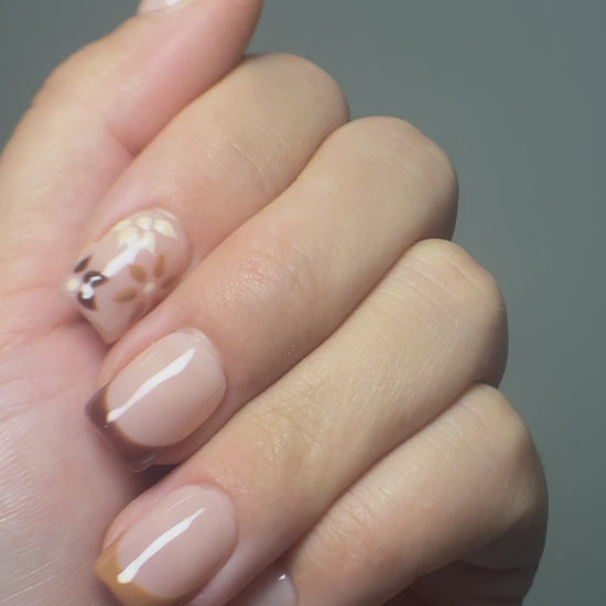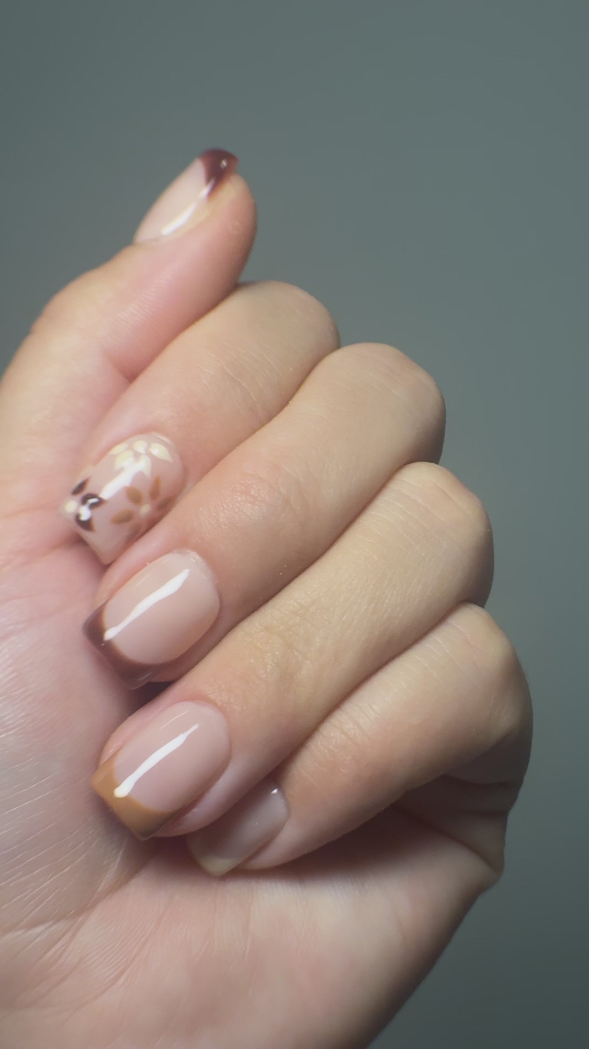 Introducing Mocha Bloom — a luxury neutral set designed for the fall lover with a minimalist heart. A semi-sheer milky nude base gives a clean, elevated canvas, while rich mocha and caramel tones bring warmth through mixed French tips. Finished with a single hand-painted floral accent, this set delivers the perfect balance of cozy, classy, and understated.