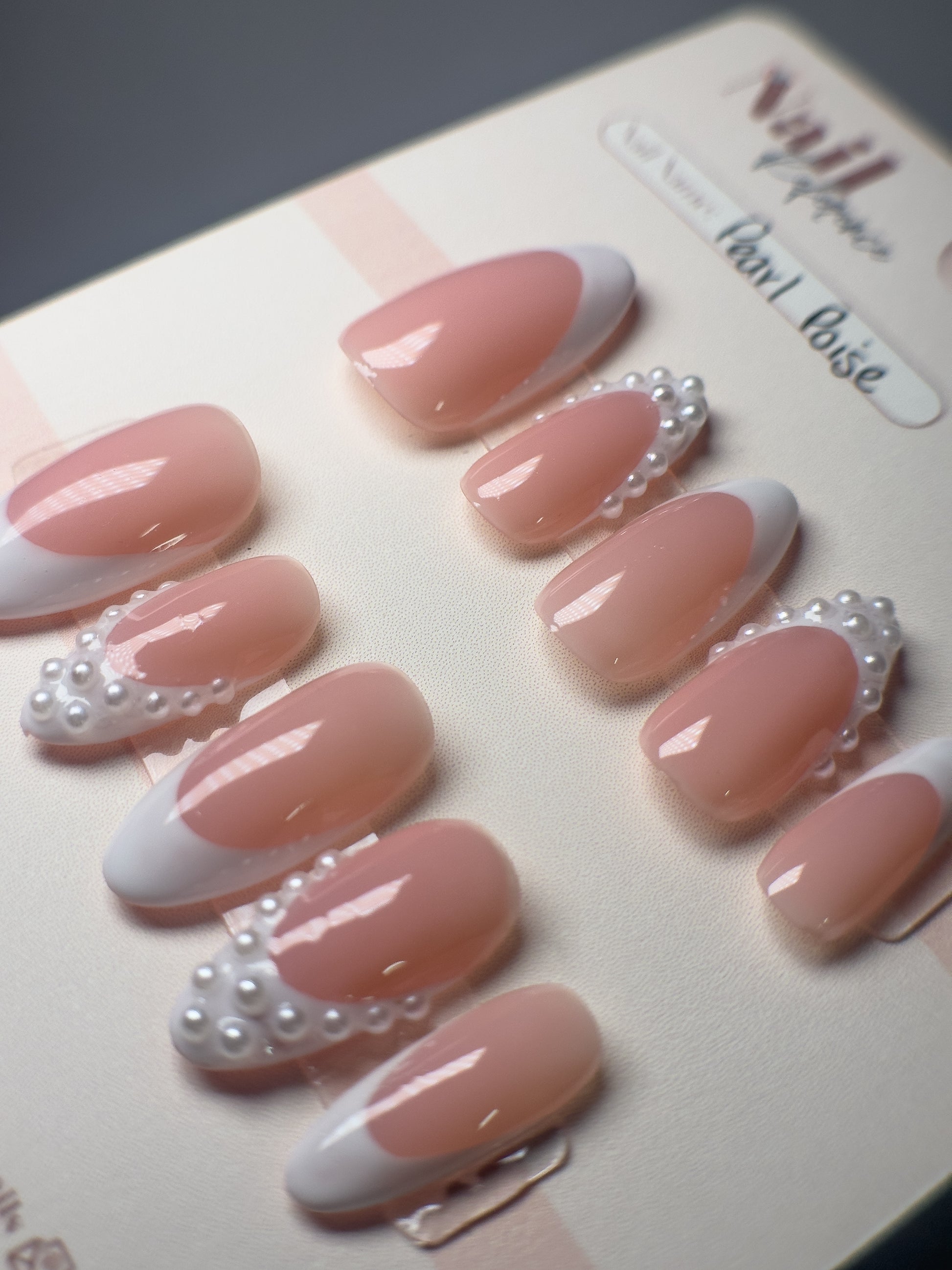 Graceful and refined, Pearl Poise elevates the classic French manicure with a delicate twist. Featuring crips white tips on a sheer pink base, this timeless look is accented with dainty pearls placed artfully on select nails. The added weddings, bridal showers, or any moment where elegance is the mood.