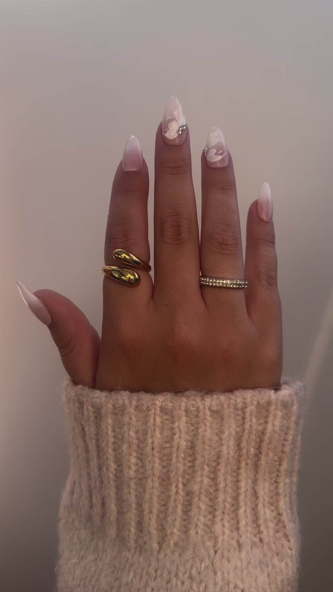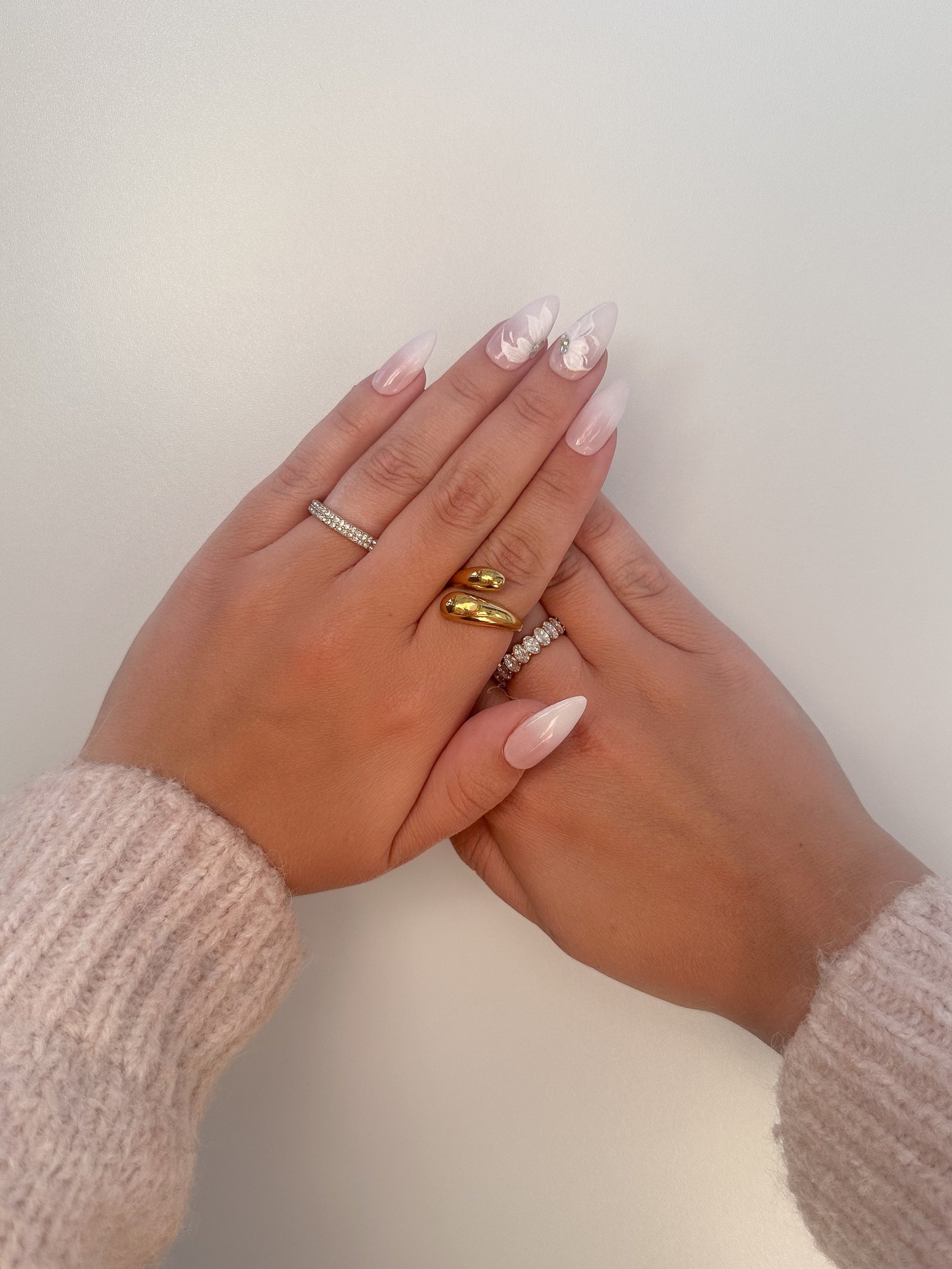 Elegant and ethereal, Petal Frost blends soft ombré tones with delicate white floral accents and sparking rhinestones. The gradient base fades gracefully - like a gentle morning mist - while hand drawn flowers and hand placed crystals on the accent nails add a touch of bridal romance and glamour. Perfect for weddings, special occasions, or anyone wanting a soft yet stunning look.