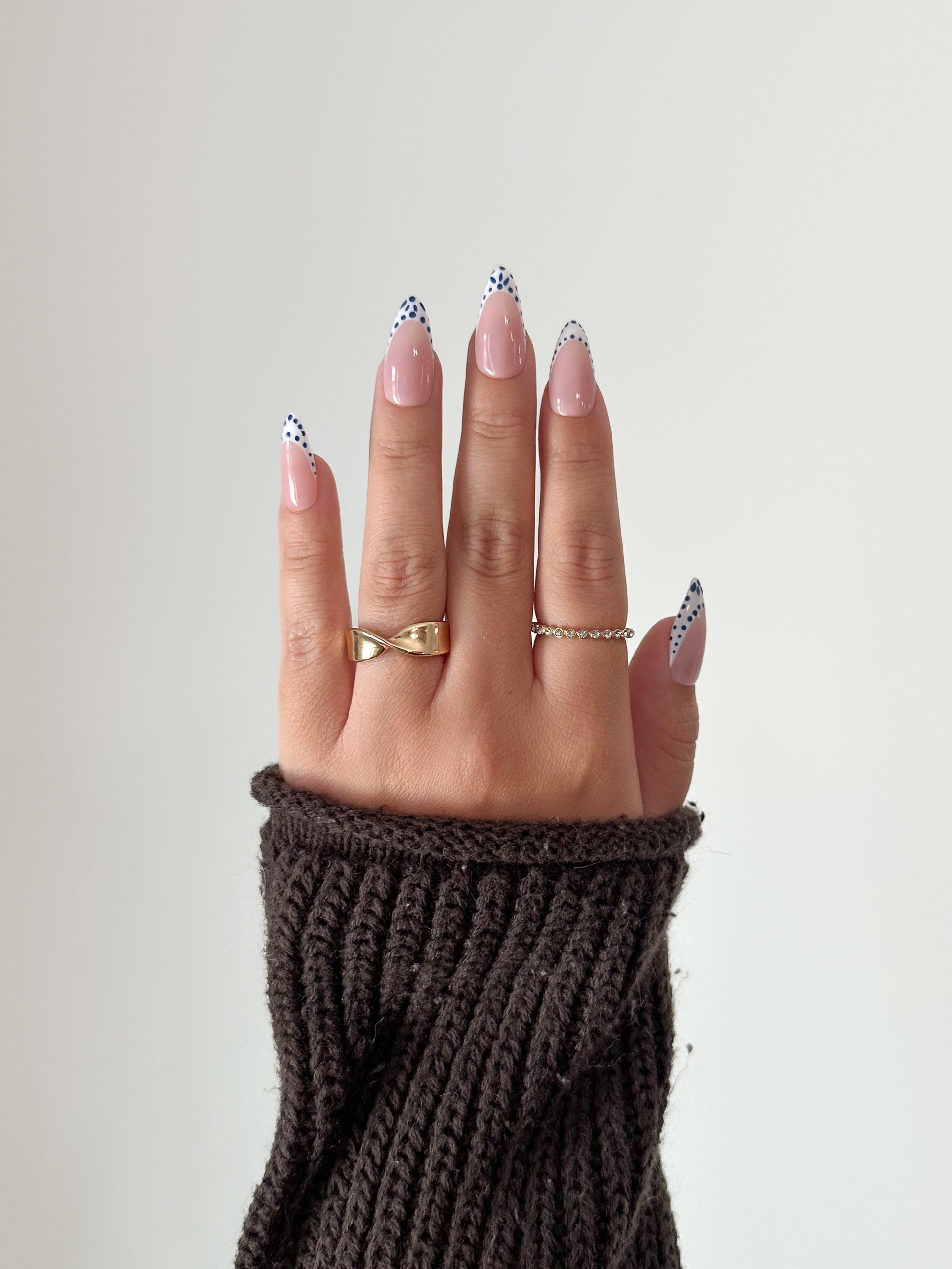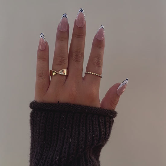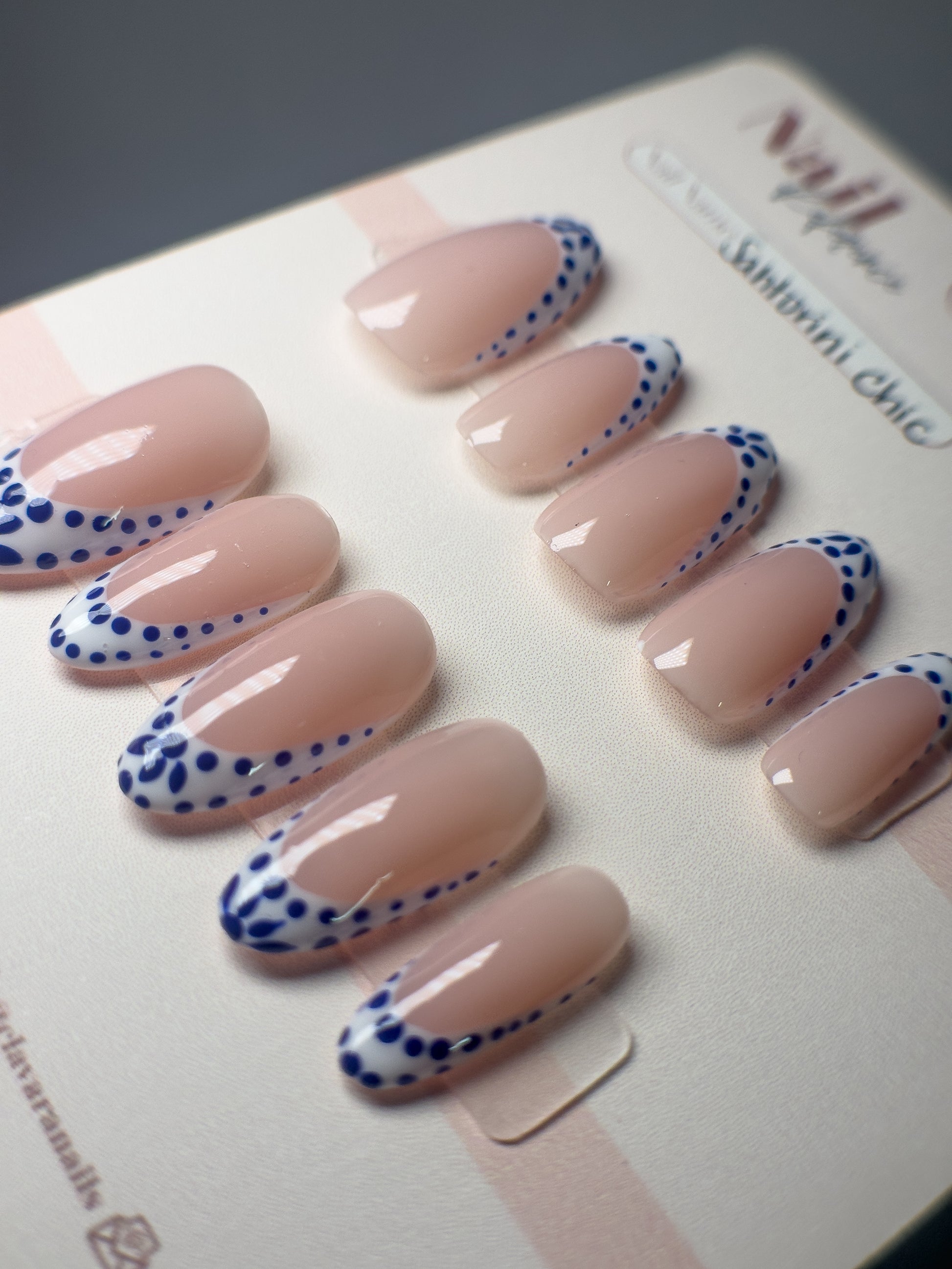 Inspired by the iconic blue-and-white patterns of mediterranean tile-work, Santorini Chic is a fresh take on the classic french manicure. Crisp white tips meet intricate blue tile designs, evoking the charm of sunlit coastal villages and handcrafted ceramics. It's the perfect blend of tradition and trend - ideal for vacations, summer events, or adding a little wanderlust to your everyday look.