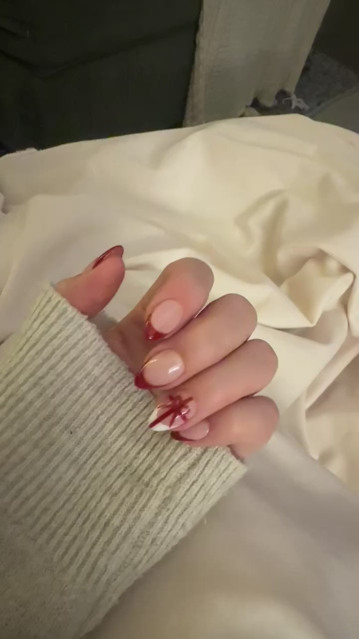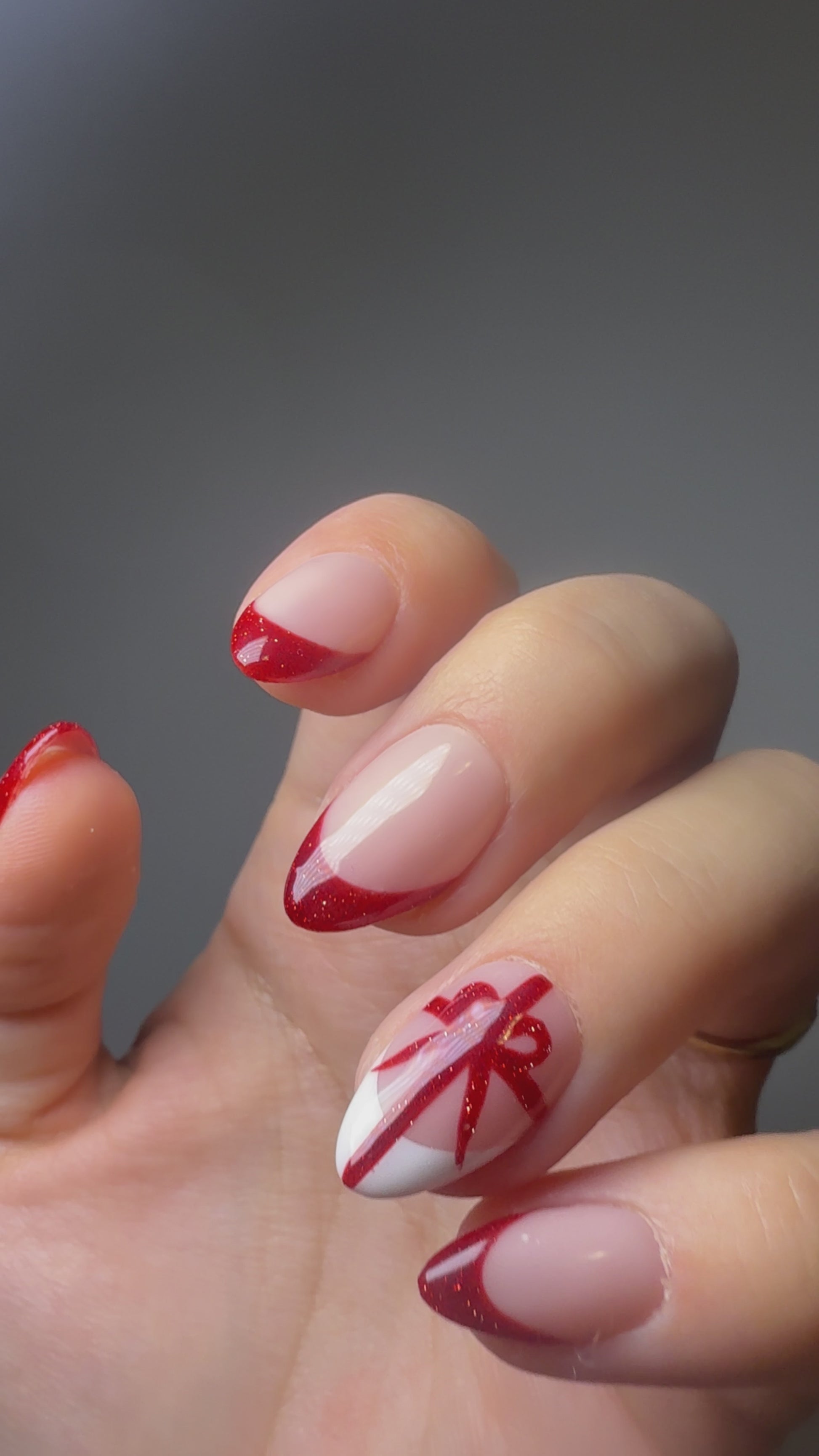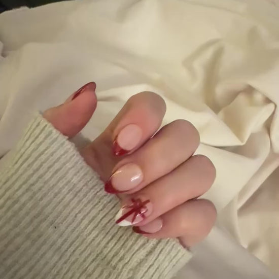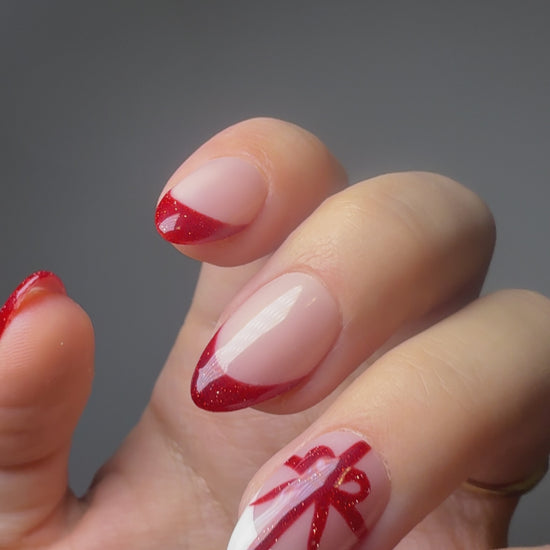A soft nude base meets shimmering ruby red details for a timeless, festive finish. The ribbon accent adds a playful, gift-wrapped touch while keeping the overall look classy and elevated. Scarlet Gift is perfect for holiday events, winter photos, or anyone who loves a hint of luxury in their everyday style.