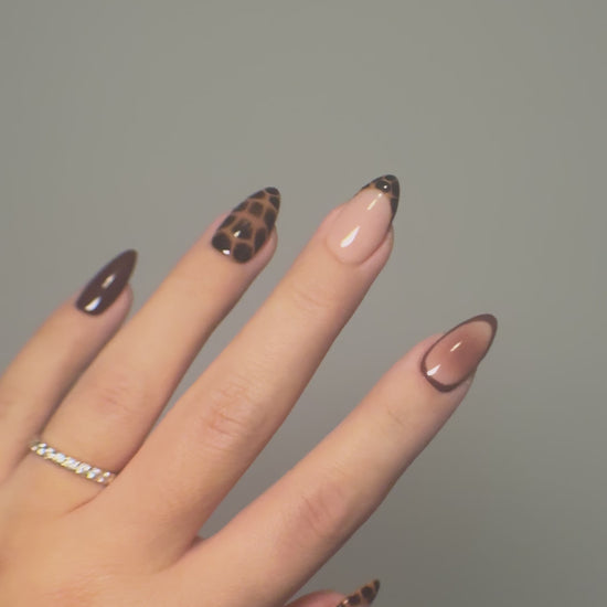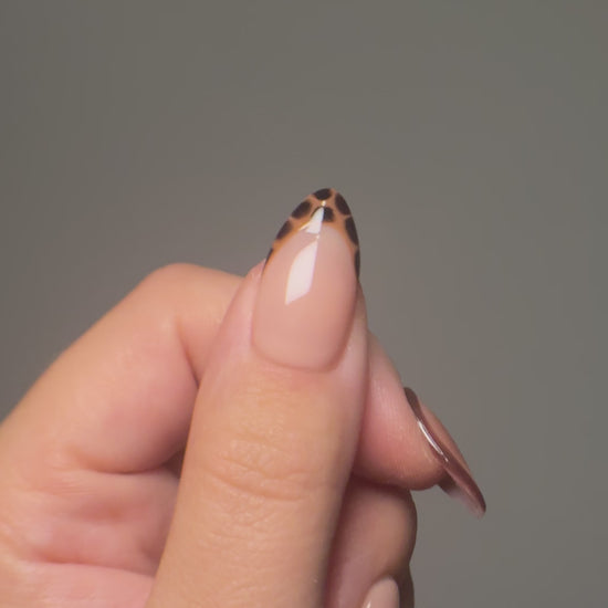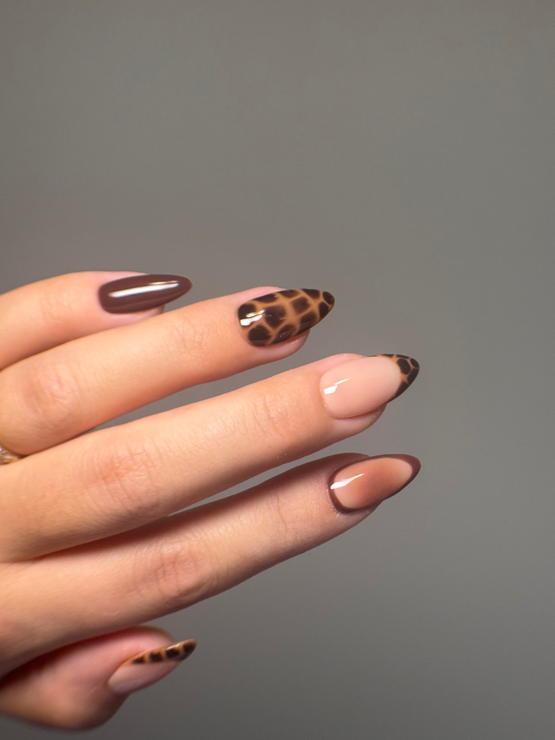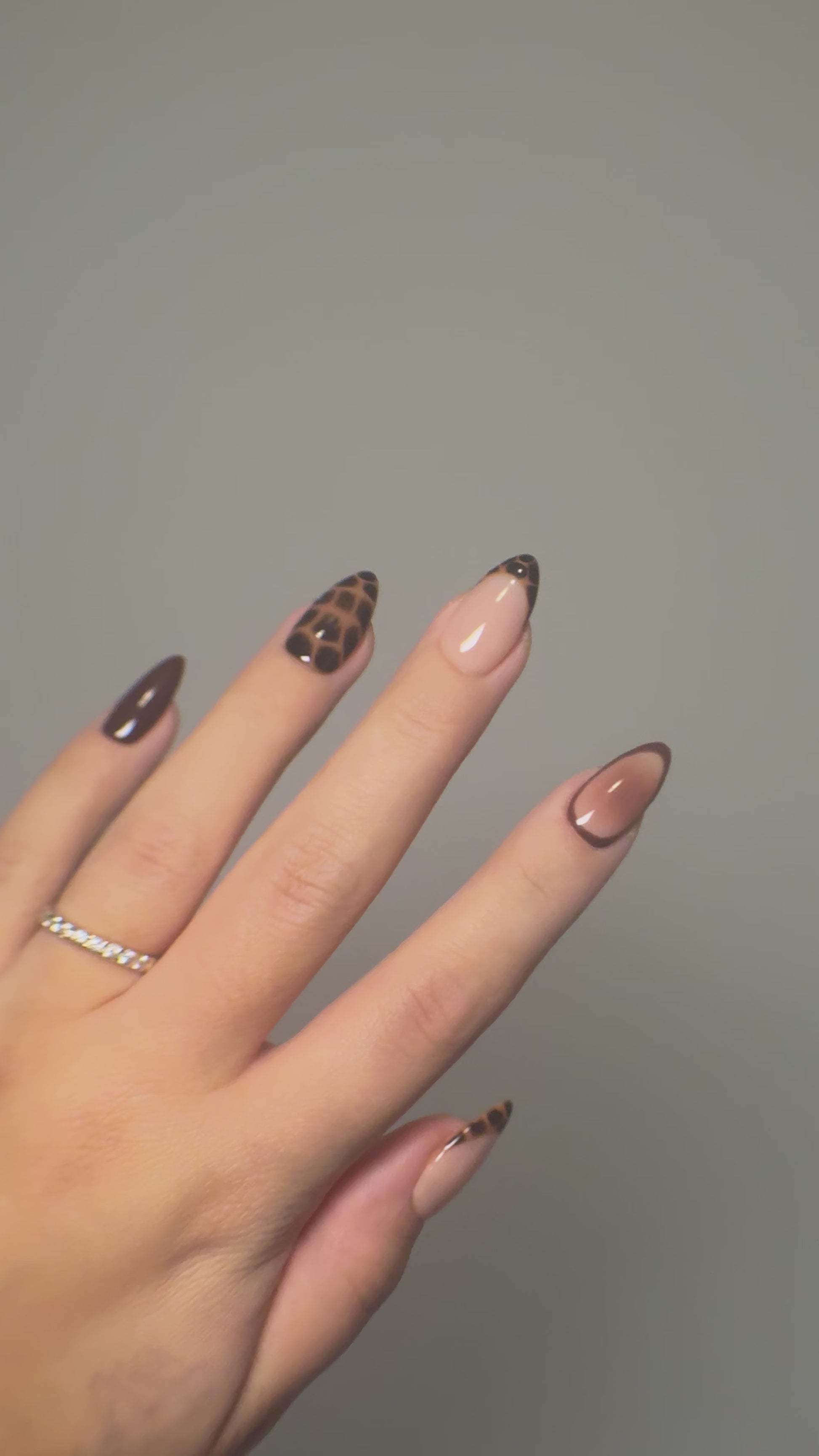 Tortona is a set in warm mocha tones with a hand-painted tortoise pattern and brown shade tips. A quiet-luxury neutral with just enough edge to read designer on the nails.